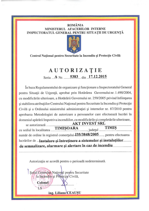 Autorizatie IGSU pentru instalarea si intretinerea sistemelor si instalatiilor de semnalizare, alarmare si alertare in caz de incendiu ;