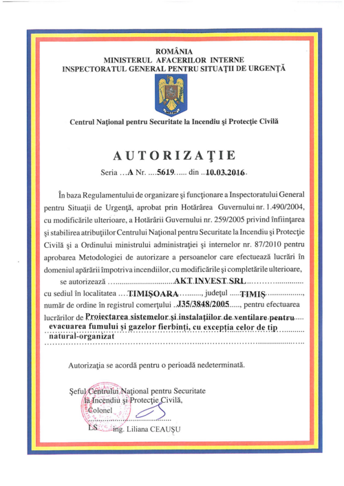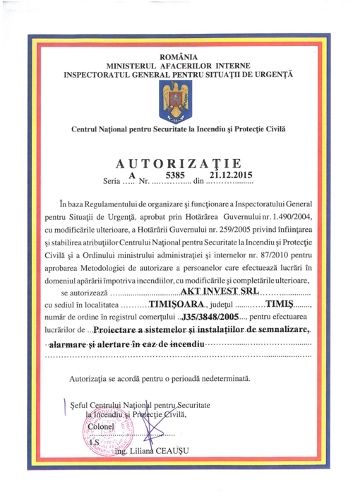 Autorizatie IGSU pentru proiectarea sistemelor si instalatiilor de semnalizare, alarmare si alertare in caz de incendiu ;