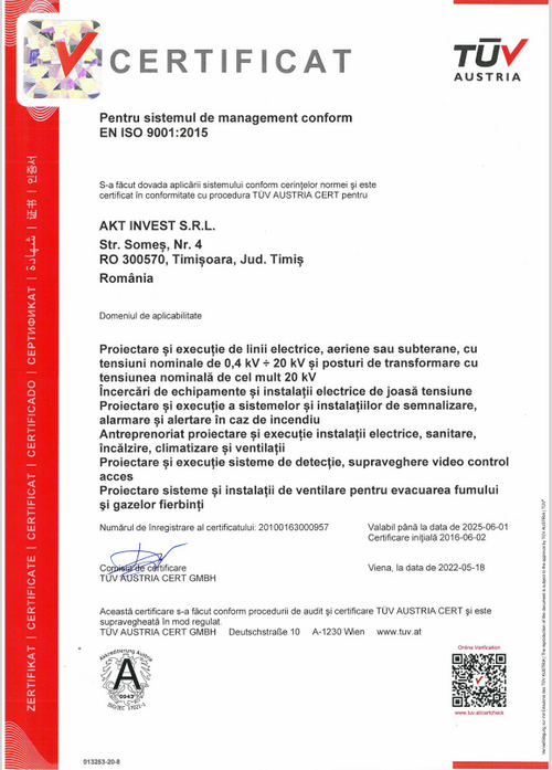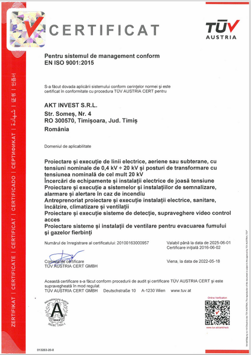 Certificat TUV pentru sistemul de management conform EN ISO 9001:2015;