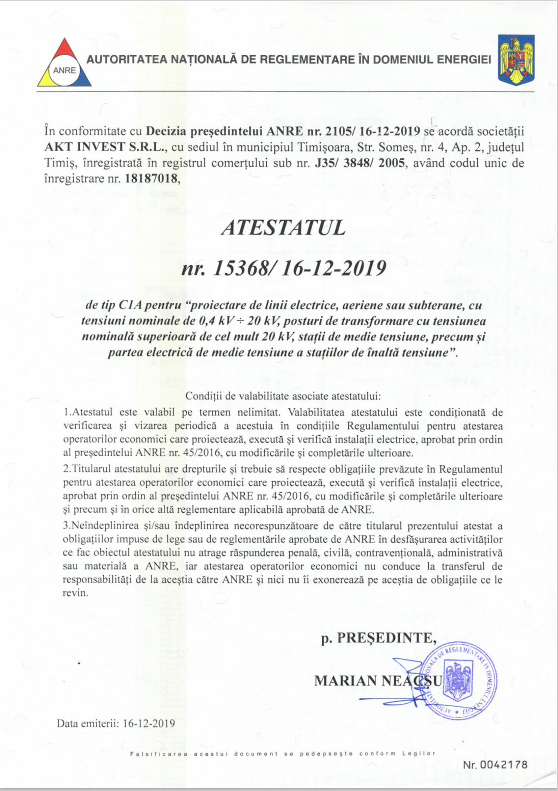 ANRE tip C1A pentru proiectarea de linii electrice, aeriene sau subterane, cu tesiuni nominale de 0,4kV -20kV si posturi de transformatoare cu tensiunea nominala superioara de cel mult 20 kV, statii de medie tensiune, precum si partea electrica de medie tensiune a statiilor de inalta tensiune ;