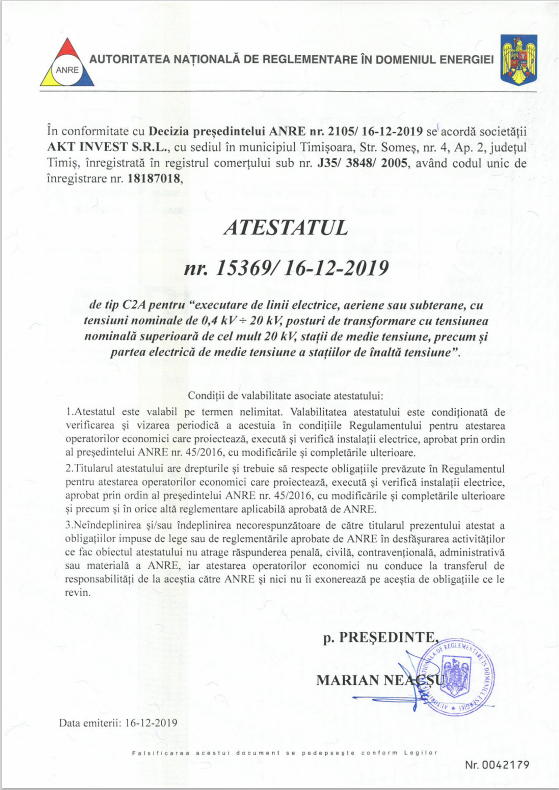 Atestat ANRE tip C2A pentru executarea de linii electrice, aeriene sau subterane, cu tesiuni nominale de 0,4kV -20kV si posturi de transformatoare cu tensiunea nominala superioara de cel mult 20 kV, statii de medie tensiune, precum si partea electrica de medie tensiune a statiilor de inalta tensiune ;